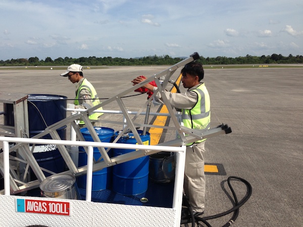 Refueling at Hat Yai was surprisingly efficient and fast. Everything was organized by WoA in Singapore and Thailand. I have a contact number, but I am not sure exactly what organization is behind the ground handling there. They even had Avgas in 50L drums, which is great, since you do not run the risk of paying for a lot of unused fuel. I paid 69.25 Baht for a liter, but had to buy an entire drum, even so I only needed about 30L. I think that is acceptable. It would be even better if a couple of aircraft need to be refueled.