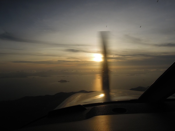 I considered staying in Hat Yai over night, because by the time I finalized all the formalities, it was almost 5 pm. My mental calculation, however, told me that I can get to Phuket before the official sunset at about 6:45 pm. I didn’t anticipate the strong headwind though. At 7,500 feet over the mountains, I had the throttle wide open, made 135 knots true and got barely 95 knots ground speed for my troubles. My stress levels shot up considerably and at Trang, I thought I would have to divert to Krabi to down on the ground before the sun disappears. I understand that Phuket International does not like VFR flights after sunset at all! It’s a big deal.