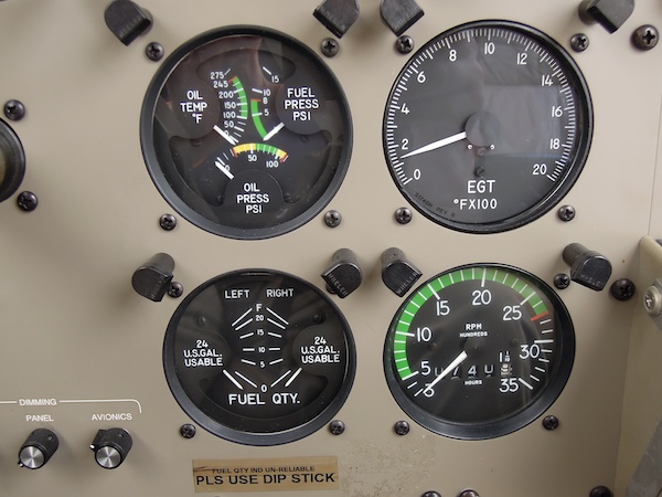 - One exhaust gas temperature gauge (very useful for leaning the engine). Probe is connected to the front-right cylinder.