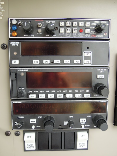 Top to bottom: audio panel, auto pilot, GPS, radio, radio master switch, pitot heat switch