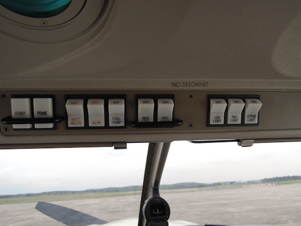 Overhead switches left to right: starter, primer, master, alternator, fuel pump, left/right magneto, landing/nav/strobe light