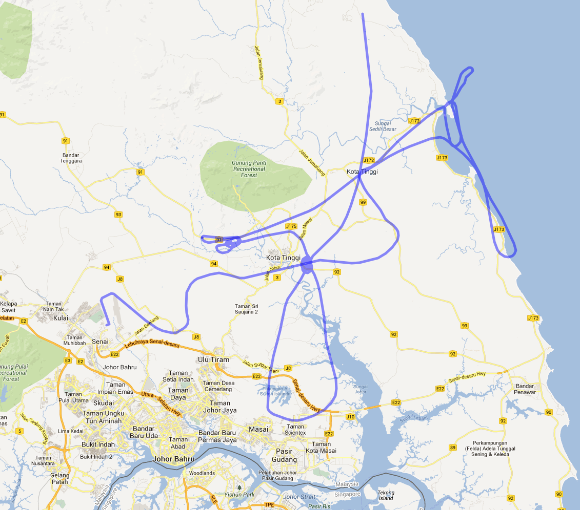 I managed to go in the right direction, but lost my nerves close to Kota Tinggi, where I descended to 1000 feet again to track the ground.